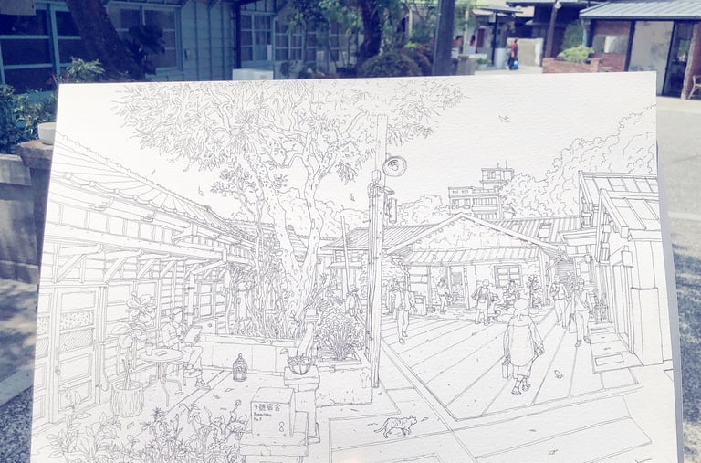 Known for his prolific on-location drawings of urban environments, Bond has sketched more than 30 cities across Asia and Europe—including Shanghai, Paris, Hanoi, Hong Kong, and multiple regions in Taiwan—building a body of work that captures both the architecture and the emotional essence of place. His series-based approach brings together the immediacy of field sketching with the deliberate structure of illustrated storytelling.